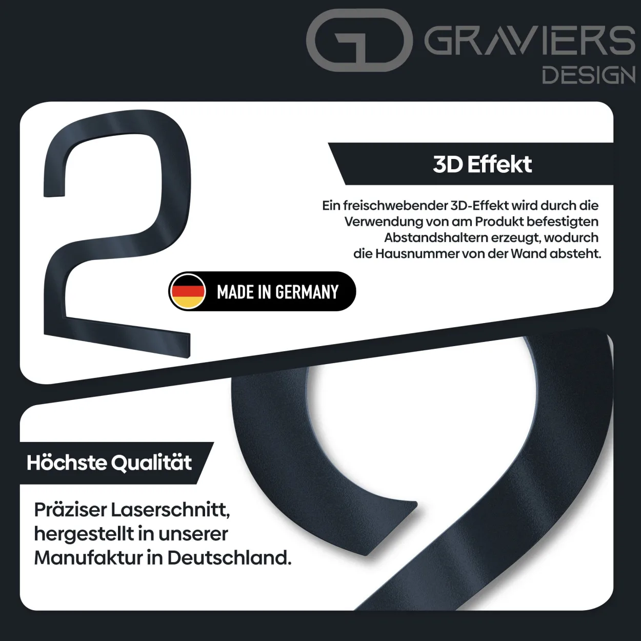 - ✅ 1x Hausnummer aus massivem Stahl, pulverbeschichtet in RAL7016