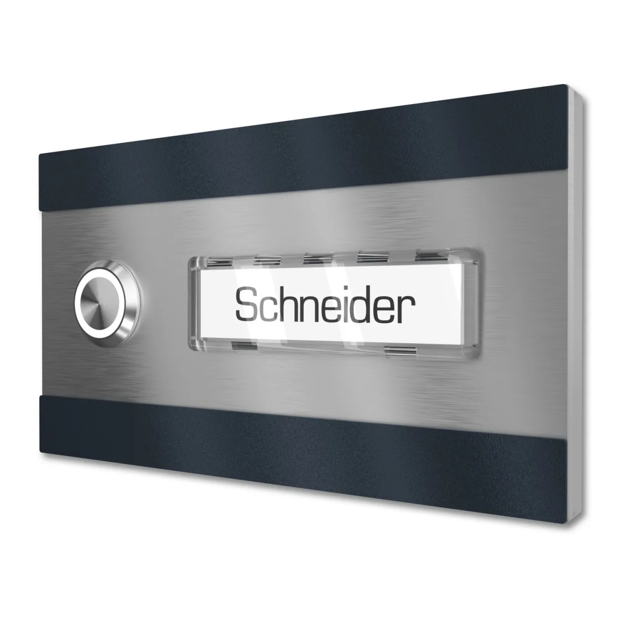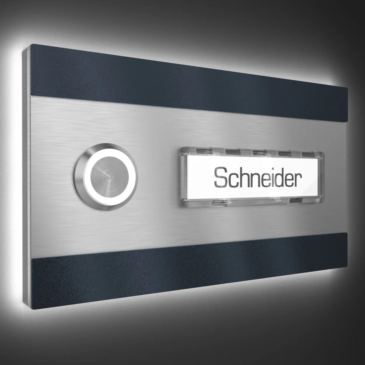 First impressions count! The doorbell is the first thing your guests, neighbours and parcel couriers come into contact with when they come to your door. If you want to make a modern and timeless impression, our surface-mounted doorbells are just right. Depending on which colour, shape and size you prefer, you can choose from a range of our high-quality models. Discover, for example, our best-selling single-family doorbell 1 engraved RAL 7016, a popular silver-anthracite colour combination that will create an eye-catching feature in your entrance area. Our doorbell with engraved stainless steel + black house number in silver and black is elegant and unique. The optional backlighting ensures a wow effect at any time of day. Once you have chosen your favourite design, there are numerous personalisation options available to you. Decide freely on the font, bell buttons, LED lighting, fastening and engraving text alignment and you will receive a unique item that has been manufactured entirely according to your wishes.