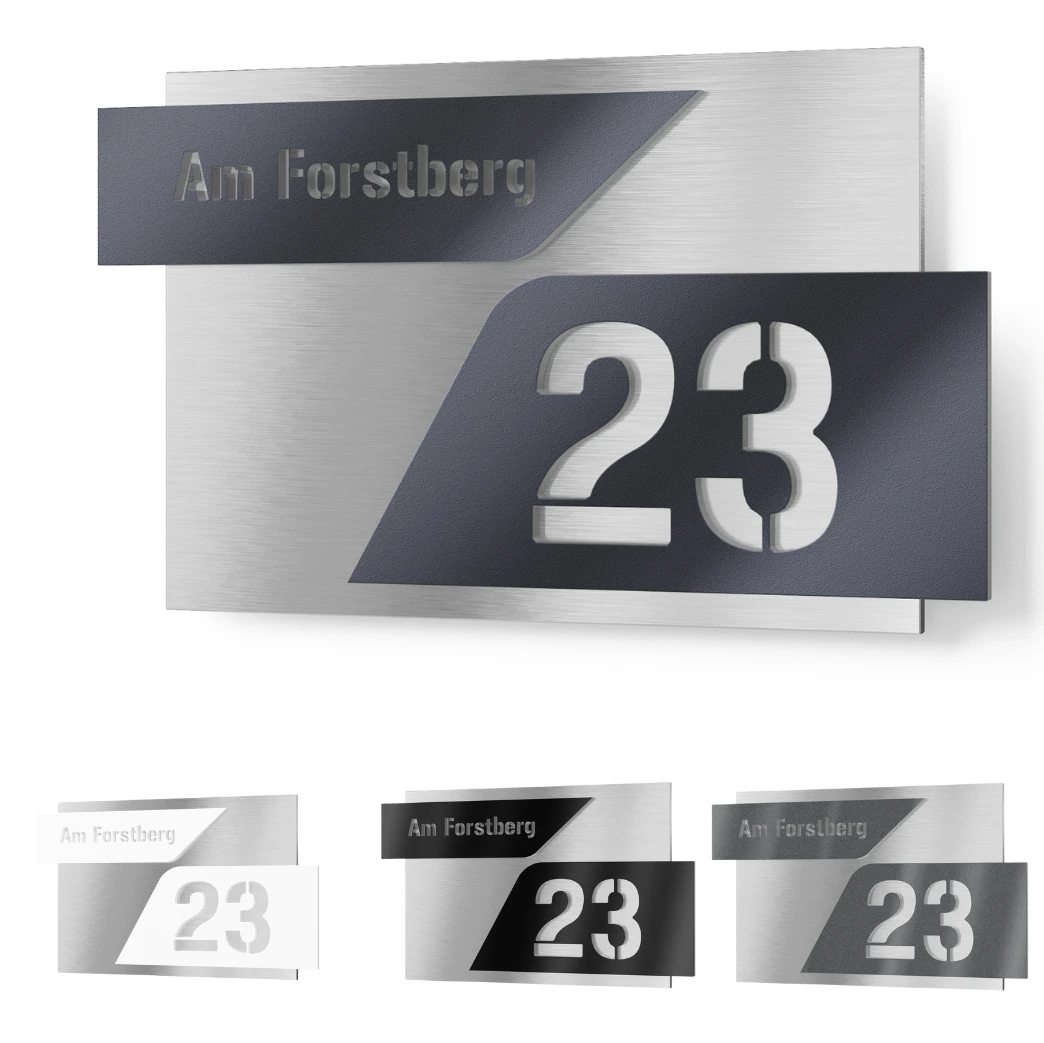 Se desiderate mostrare, oltre al numero, anche il vostro nome o la via, disponiamo di modelli con un’area di incisione aggiuntiva. Queste varianti sono ideali sia per abitazioni private sia per ingressi di uffici o negozi. Inoltre, potete scegliere tra diverse finiture e colori, in modo da integrare la targa perfettamente con la vostra facciata e i vostri gusti personali.